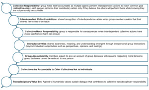 Notwithstanding, group accountability is defined as an emergent understanding of how things are done within the collective. This understanding depends mainly on “multiple evolving subjectivities rather than formal accountability structures. [This group] is a ‘forum’ for moral tensions that often must be worked through by the members themselves” (Stewart et al., 2023, p. 703). Harken Miller’s (2001) collective moral responsibility concept, which becomes relevant when collective actions have moral significance.